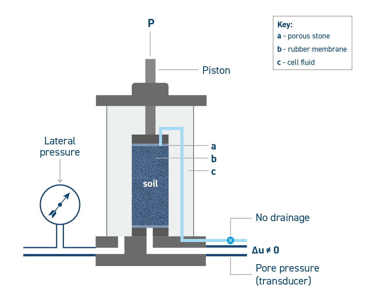 En un ensayo no drenado, no se permite que la probeta drene - su volumen no cambiará durante esta etapa pero sí su forma, lo que dará lugar a un desarrollo de la presión de poros que se medirá. Si se permite el drenaje, el agua saldrá de la probeta durante la fase de corte, lo que permitirá que el volumen y la forma de la muestra cambien mientras se evita que cambie la presión de poros.