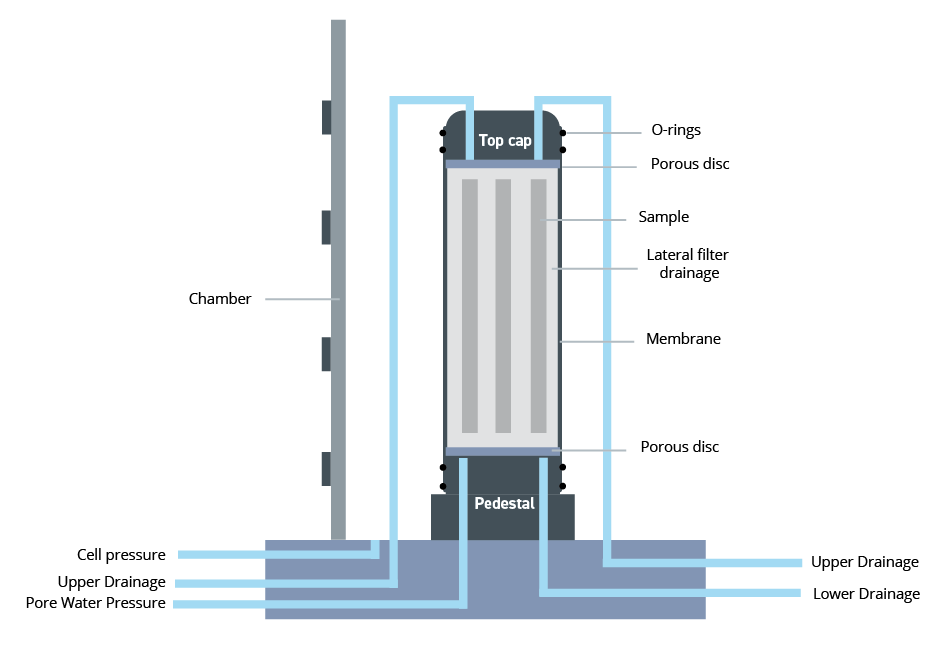 Los ensayos triaxiales típicos consisten en confinar una muestra de suelo cilíndrica sellada, con una relación altura-diámetro de 2:1, en una célula presurizada para simular unas condiciones de tensión definidas. A continuación, la muestra se somete a un esfuerzo de corte hasta el fallo, lo que permite determinar sus propiedades de resistencia al corte. Por lo general, la muestra se satura primero, luego se consolida y finalmente se somete a carga, sobre todo en condiciones de compresión.