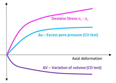 Dado que la resistencia al corte se ve afectada por las tensiones efectivas, al ensayar un conjunto de tres probetas a diferentes presiones de confinamiento, es posible definir la envolvente de rotura según el modelo de Coulomb y definir los parámetros c’ and φ’, así como evaluar la resistencia al corte no drenada.