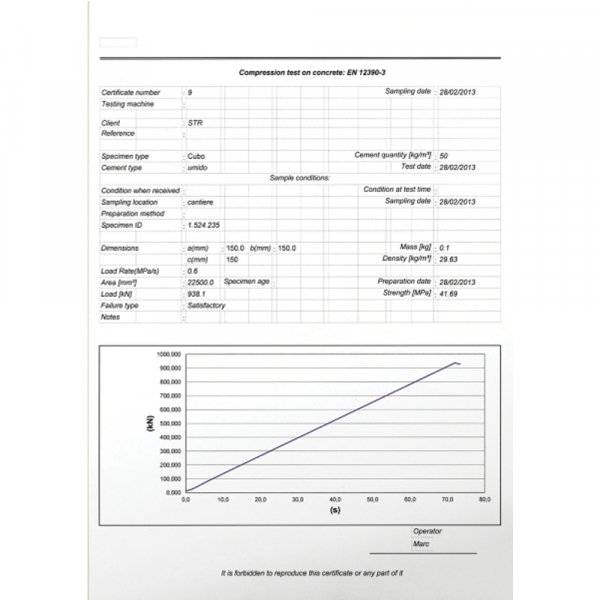 The produced test certificate is customizable and includes all descriptive information, test results and stress vs. time diagram. The conformity to standards of test execution is therefore proved.