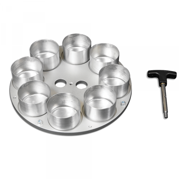 The vacuum chamber can accept either eight 55x35 mm or four 70x45 mm (available as accessories) sample containers. The instrument is supplied complete with temperature traceable calibration certificate, 8 aluminium 55x35 mm sample containers,a double face sample holder and operator's manual.