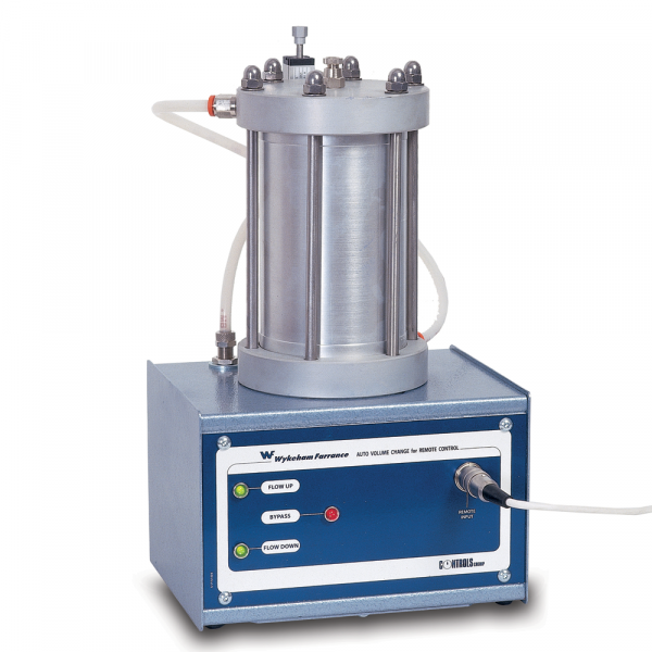 The design is based on the standard volume change device with integral solenoid valves that allow the flow direction and bypass functions to be controlled by the pressure extension unit - unsaturated. The device has a physical capacity of 100 cc but due to the automatic switching, it can measure volume change continuously. It is powered directly by the pressure extension unit - unsaturated and has LEDs on the front panel to show the flow status.