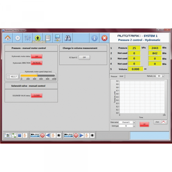 The AUTOTRIAX EmS software is a comprehensive and user-friendly interface between the operator and the testing system. Installed on a PC communicating with the system over a fast Ethernet connection, the software can be used to configure the system(s), calibrate transducers, specify test parameters, set system limits and control the system during a test, either manually or automatically. Due to the flexibility of the software, each triaxial system can either have its own, dedicated PC, or multiple systems can be run from one PC.