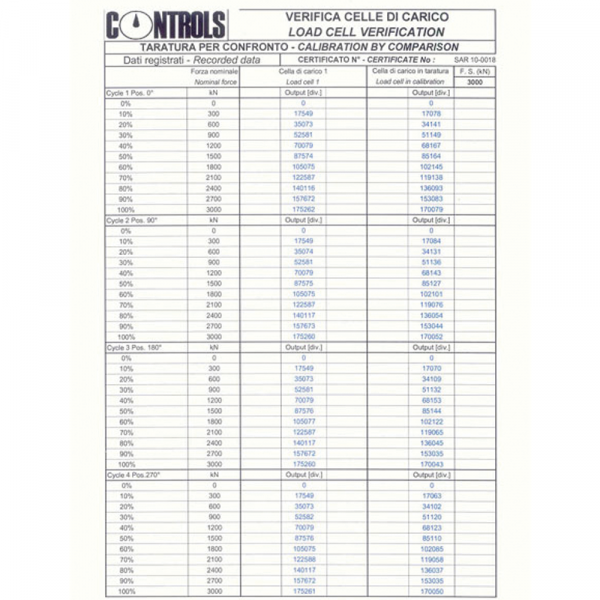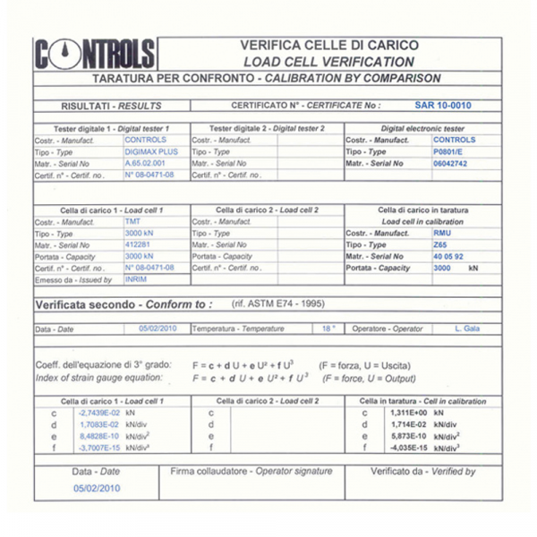 The system, connected to any strain gauge load cell, provides data for the force verification of the testing machine. Data can be printed by a standard serial printer as, for example, our model 82-P0172  with serial cable 82-P0172/1 (see accessories), or unloaded to PC for processing and, by the relevant MS Excel template 82-P0804/E4 (see accessories), for producing the test certificate conforming to the standard in use as, for example, EN 12390-4 or ASTM C39 for concrete compression testers.