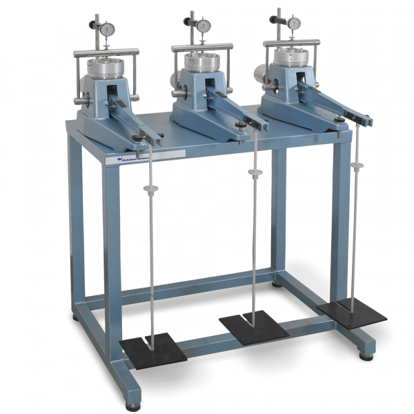 The oedometer consists of a rigid aluminium alloy frame to avoid any distortion under load. The lever arm assembly is supported in precision self-aligning bearings and has three hanger positions for 9:1, 10:1 and 11:1 ratio. The oedometers fit with linear potentiometric transducers, can be connected to Data acquisition unit.