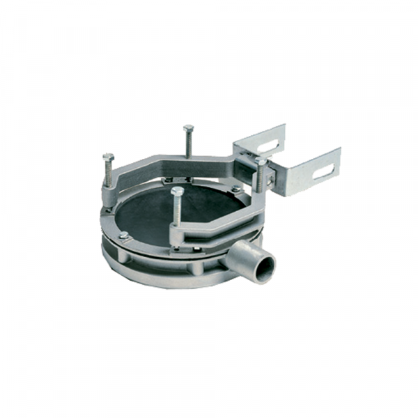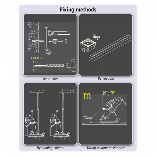 These three parts can be easily assembled and disassembled for transportation. The support steel column can be angled with respect to the base. The motor support is mounted on rollers and ball bearings. The aluminium base can be easily fit on site by anchors, by suitable holding column or by vacuum using the appropriate accessory (see accessories). The machine can be used at any angle within the horizontal position by the appropriate fixing making sure that flushing water does not drop directly onto the motor . For internal use we suggest the machine is fit with a water collector system (see accessories, 83-C0350/5 Water collecting ring).