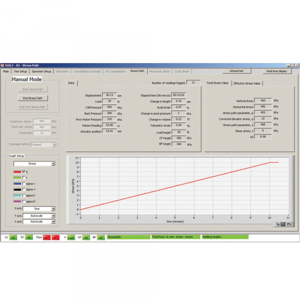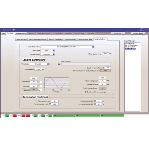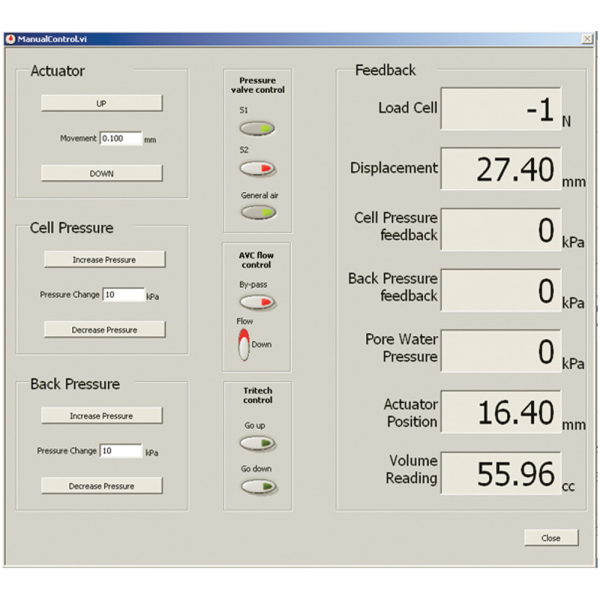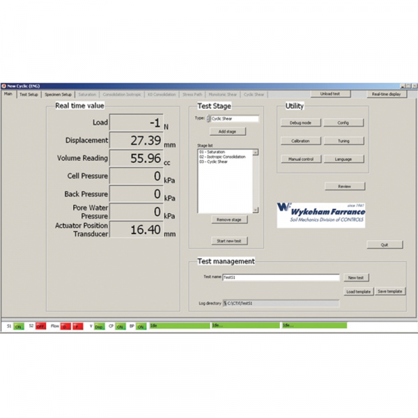 The CDC manages up to 3 closed loop axes (axial load/displacement, cell and back pressure) with an effective loop rate of 10 kHz and performs the test completely automatically including the on/off valves for the drainage line and for the air supply to the triaxial cell. It is linked to the PC via LAN/Ethernet link (1 Gbit/s) and comes with 16 transducer ports (real resolution 16 bit).