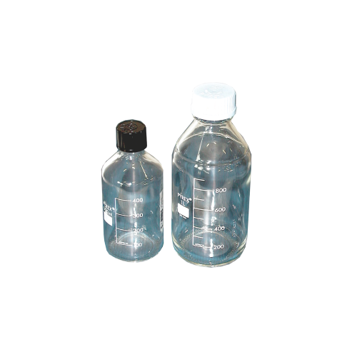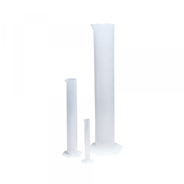 Glass measuring cylinders, graduated with spout. Plastic measuring cylinders, tall form with spout.  Plastic measuring cylinders, low form, with...