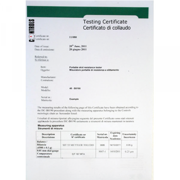 - Traceable certificate of conformity to EN 1097-8 or ASTM E303