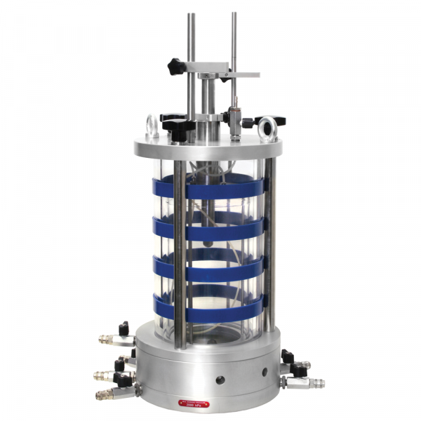 Double wall triaxial cell, inner wall made from glass, complete with acces ring for transducer cables. The cell has to be completed with the base pedestal with High Entry Stone.