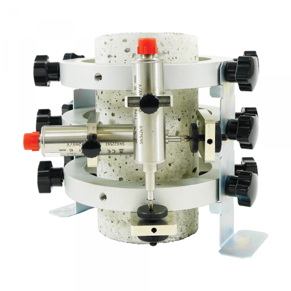 The compressometer / extensometer for static Modulus of Elasticity and Poisson’s Ratio to ASTM C469 is a device for measuring the longitudinal strain and corresponding diametrical strain of dia.150x300mm (6"x12") and dia.100x200 mm (4x8") concrete cylinders, or core, subjected to axial loading. It works by measuring the relative displacement of datum points on the cylinder surface.