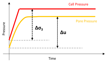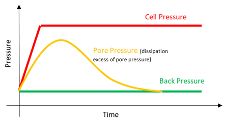 Durante este proceso, se calcula el coeficiente de presión de poros B para determinar el grado de saturación. Estos pasos se repiten hasta que la muestra está saturada. La mayoría de las normas establecen que un valor B superior a 0,95 indica que la muestra está suficientemente saturada. El valor B se calcula como una relación entre ∆u = Cambio en la presión de poros y ∆σ3 = Cambio en la presión de confinamiento; B= ∆u/∆σ3