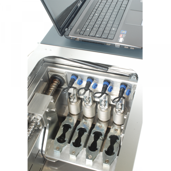Automatic measurement of the elongation by an encoder. Includes a system for measuring forces up to 2000 N (4 x 500 N) with load cells (see accessories).