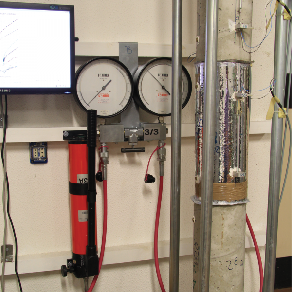 This test is performed for measuring the shrinkage of cylindrical specimens under constant loads at different time intervals. The apparatus consists of a load frame designed to apply and maintain the required load on the specimen. The initial compression is applied by a portable hydraulic jack. The load maintaining element is a series of springs preloaded by the hydraulic jack.