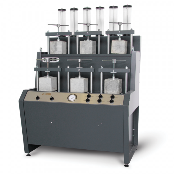 This apparatus is used to determine the depth of penetration of water under pressure in the concrete specimens. The test is performed clamping the specimen - cubic, cylindrical or prismatic of length of edge, or diameter not less than 150 mm - between two flanges with special circular gaskets. The water, under controlled pressure, is then applied to the surface of the concrete specimen. The penetration of water is measured, after the testing period, by breaking the specimen. The quantity of penetrated water, can also be measured through the graduated burettes fitted on top of the apparatus.