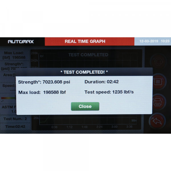 • Recording facility for up to 9 test profiles for each channel including: type of test (e.g. compression, flexural, indirect tensile), specimen size and shape, load rate, test standard and other general information. Each one of the recorded test profiles can be recalled automatically to save time