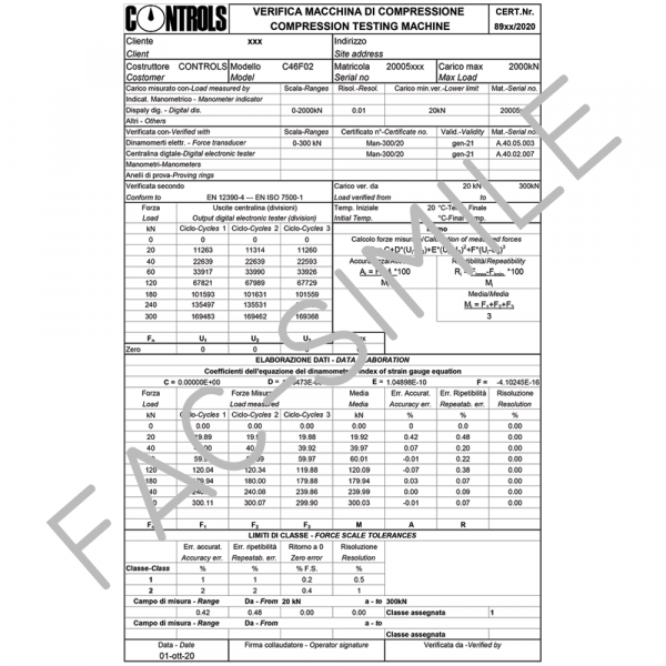 The special calibrations are useful to extend the Class 1 load measurement accuracy in the lower part of the scale. It is suggested when other test methods (flexure, indirect tensile) or low strength material testing shall be performed in the compression machine. To be specified at the time of order.
