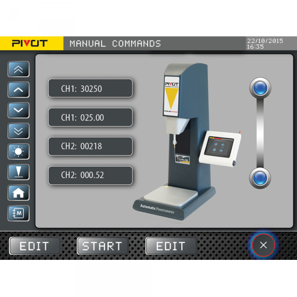 A compact instrument, microprocessor controlled, using the latest technologies and programming tools. It includes a 6" lateral touch screen display, intuitive and easy to use, which shows the penetration/time curve and can display and average up to 6 tests.