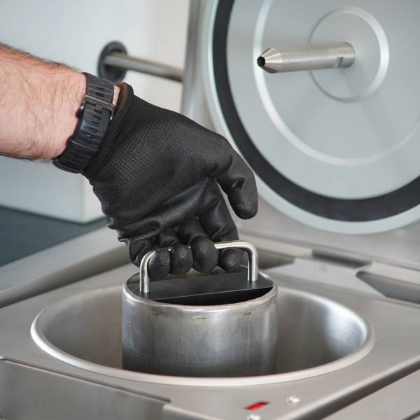 The asphalt sample (maximum 3.5 kg) is placed in a washing drum lined with a sinthered multilayer mesh with openings 0.063, 0.075 or 0.090 mm wide and it is fitted into the washing chamber. Bitumen and filler are separated from the sample by washing with solvent and ultrasonic motion. The mixture of filler/bitumen/solvent is then centrifuged and the filler is separated. The aggregates and filler are dried by forced air circulation and the residue of solvent recovered by condensation.