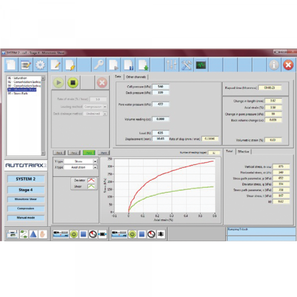 -  Multiple plot options including: Total stress/Effective stress vs. strain; axial load vs.strain; Cell pressure/Pore pressure vs. time