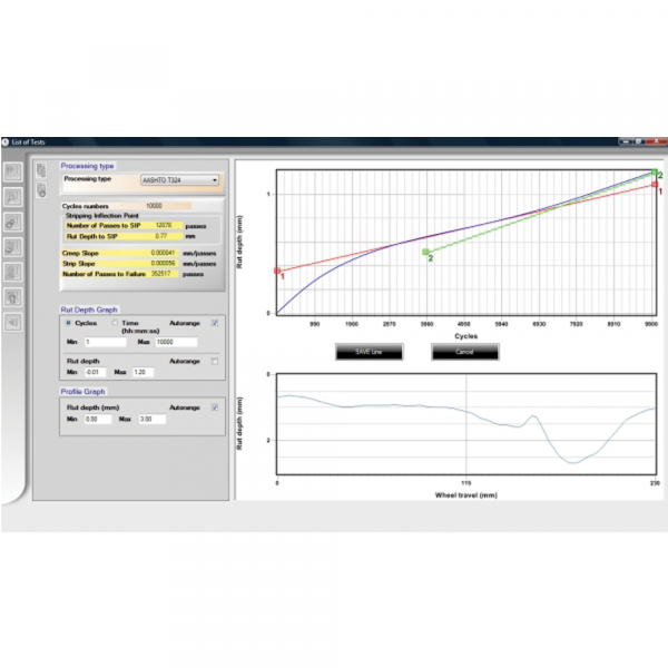 The wheel tracking test is used for determining the susceptibility of Hot Mix Asphalt (HMA) to deform under load by measuring the rut depth formed by repeated passes of a loaded wheel at a fixed temperature.  We also produce  Wheel Trackers conforming to EN 12697-22 standard and a Universal version conforming to both AASHTO and EN Standards. See Double Wheel Tracker, EN versions and Universal AASHTO/EN Double Wheel Tracker.