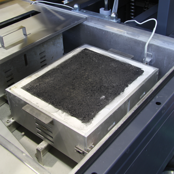 The wheel is moved 230 mm backwards and forwards on the top of the slab, which is fixed. The speed is adjustable via the PC from 20 to 30 cycles per minute (40 to 60 passes). The longest slab dimension is oriented to the wheel's direction of travel. Special slab moulds for circular samples obtained from coring or gyratory compactors are also available. See accessories.