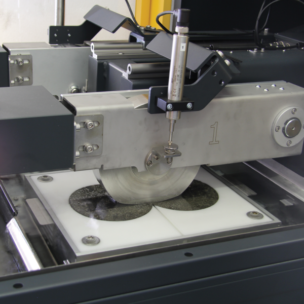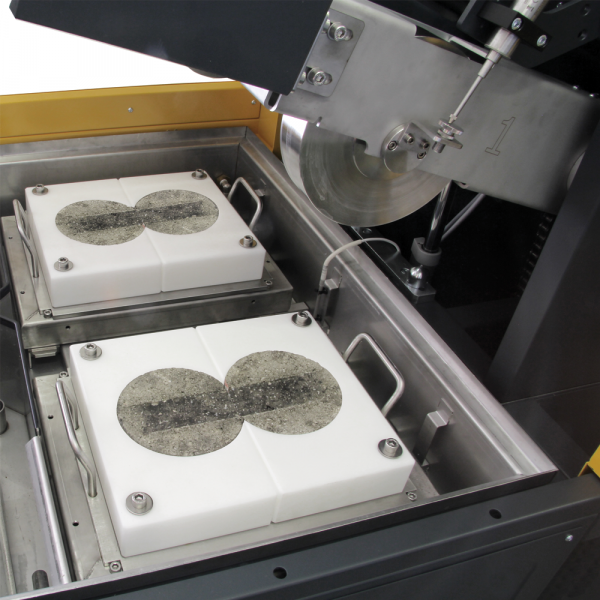 The wheel is moved 230 mm backwards and forwards on the top of the slab, which is fixed. The speed is adjustable via the PC from 20 to 30 cycles per minute (40 to 60 passes). The longest slab dimension is oriented to the wheel's direction of travel. Special slab moulds for circular samples obtained from coring or gyratory compactors are also available. See accessories.