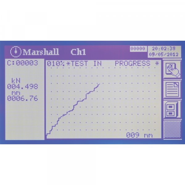 The machine can be completed with a PC software (see accessories) suitable for running CBR, Marshall, Indirect Tensile and universal load/displacement tests. Data are presented numerically and graphically in real-time: