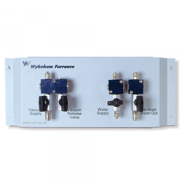 This panel controls the water going in and out of the de-airing tank. For connecting the de-airing tank to the vacuum pump. Includes water tap connection and two de-aired water outlets.