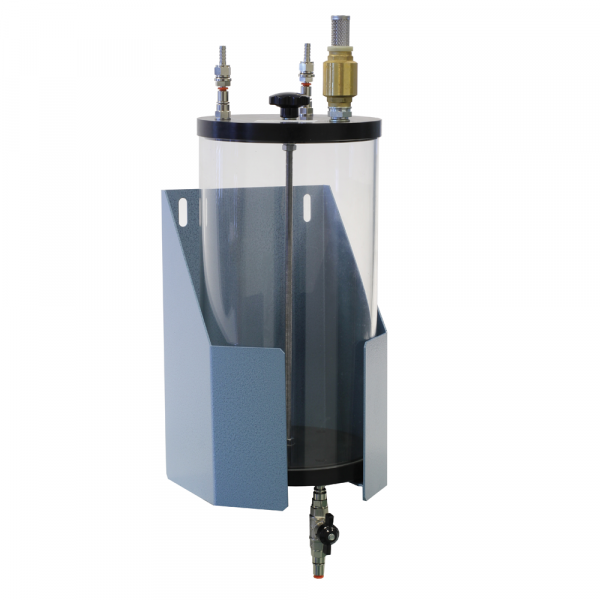 The tanks consist of a transparent acrylic cylinder fitted with a water spray inlet, an air outlet, a water outlet and a metal stand which can be wall-mounted at a suitable level to fill the triaxial system by gravity. teo model are available 7 and 23 l capacity.
