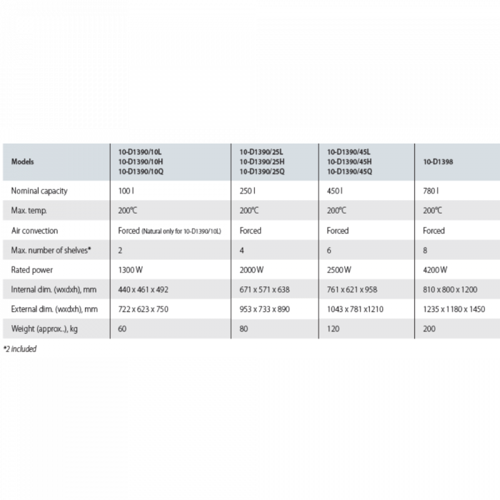 The ovens feature forced convection airflow with base-positioned fans for excellent air and temperature distribution. Temperature control from ambient to 200°C (L & H Series) and 300°C, (for Q series) is regulated via a thermoregulator with digital display. Our ovens are all equipped with mechanical safety thermostats that prevent overheating.