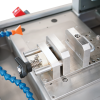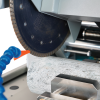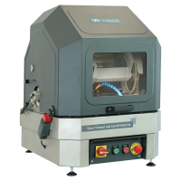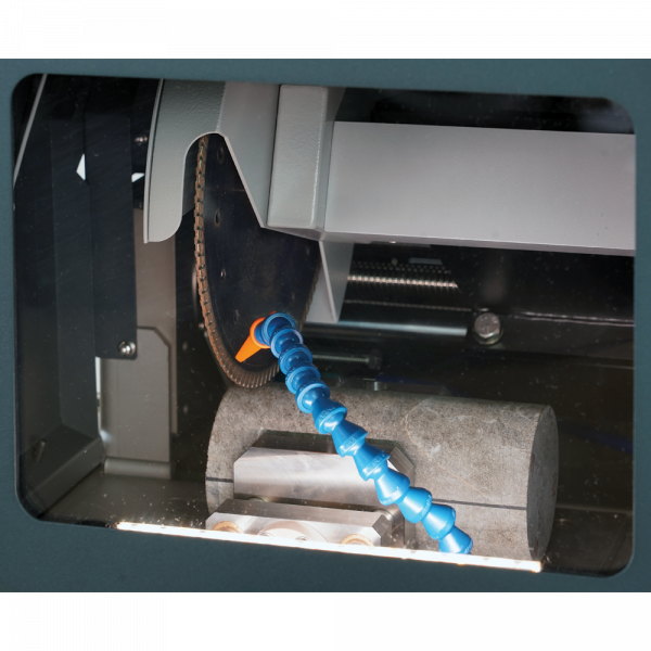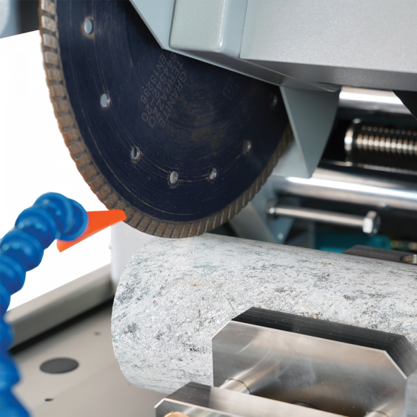 1. Specimen Cutting: Core sample rock is clamped in the jig for holding and feeding during the cutting process. During the cutting phase, water is continuously recirculated for blade cooling and flush cuttings. The precise manual feeding system moves the blade horizontally. Once the specimen is cut, back off the blade and turn off the saw. Unclamp the specimen, reposition and repeat the procedure on the opposite side.