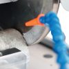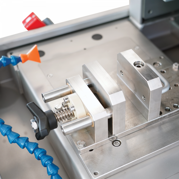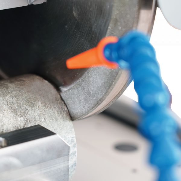 2. Grinding: In order to reach the flatness and parallelism tolerances, a grinding phase is usually required. The rock core specimen is again clamped with the holding jig and is ground using the diamond impregnated grinding wheel mounted on the opposite side of the machine. The specimen ends are typically colored with a waterproof marker, prior to the start of grinding, in order to monitor where material is being removed. Grind each end one at a time. In this phase, the cooling water system is used to cool the specimen and grinding wheel.