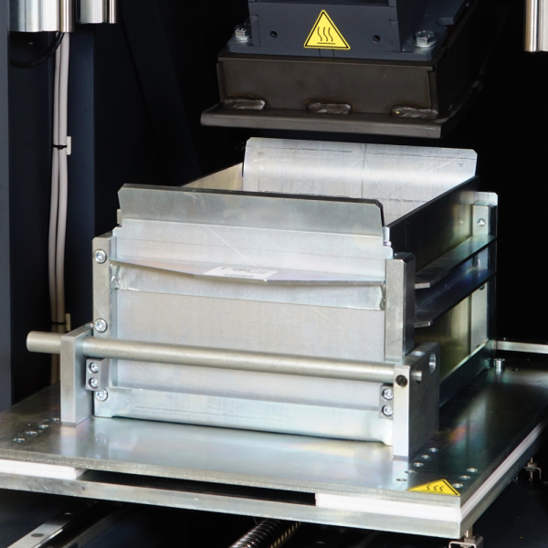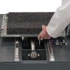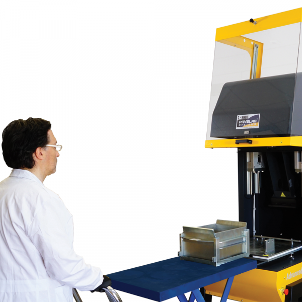 Electromechanical slab compactors feature a compacting system by roller segment head radius 535 mm. The roller segment freely moves by simple friction for better compaction uniformity. A brushless motor (standard models), or stepper motor (advanced models) moves vertically the roller segment under displacement control. the vertical load is applied orthogonally to the axis of the travel motion. the mould carriage moves back and forth by linear movement. The longitudinal (major) mould dimension correspond to the compaction direction so it is possible to obtain specimens of the proper lenght conforming to Standards. The lifting machine cover permit an easy access to the mould area. In the "rest" position, the mould is close to the operator for easy positioning while the roller segment is lifted and positioned at the back of the machine.